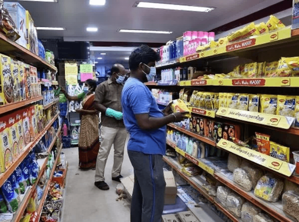 Shoppers browsing products in an Indian retail supermarket aisle.