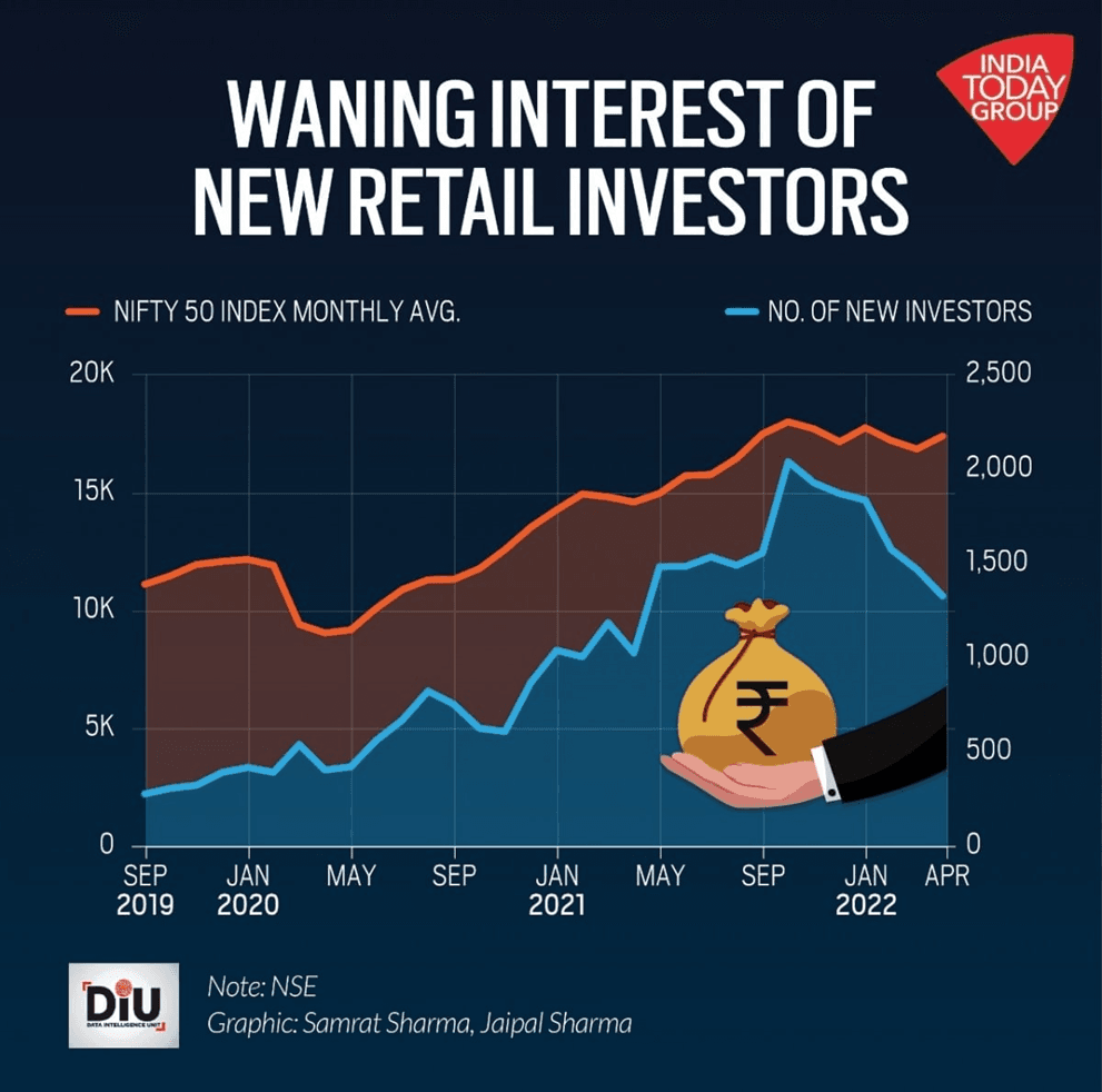 Graph showing declining new retail investors despite rising Nifty 50 index from 2019 to 2022.